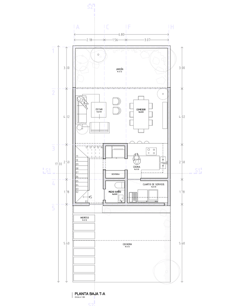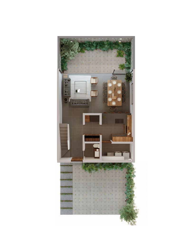Cochera, Cocina, Sala Comedor, Cuarto de Lavado, Medio Baño y Jardín.