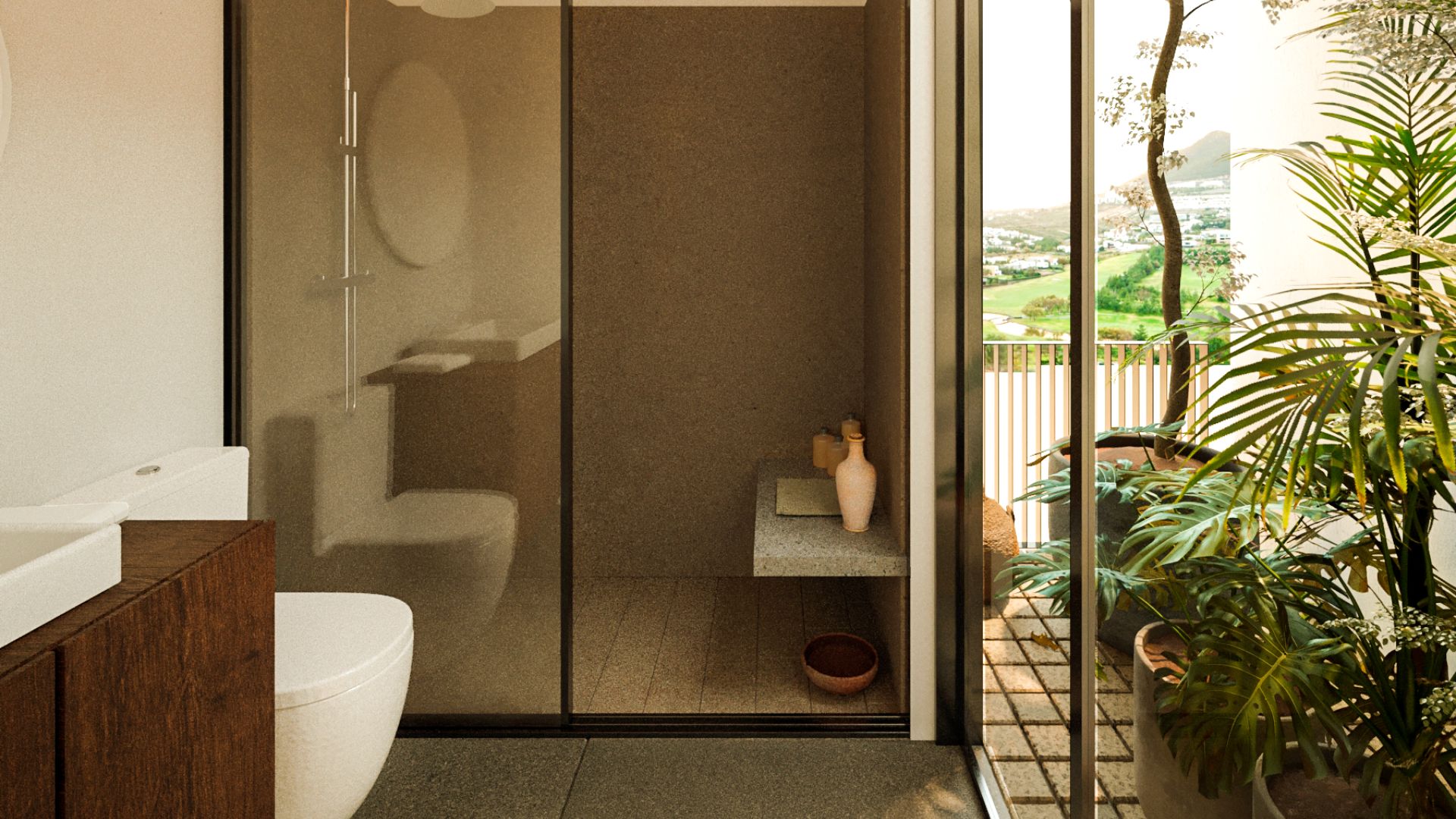 Los baños en Encuentro Morelos cuentan con un gabinete fabricado en madera de parota con cajones, sirve de base para el lavamanos, montado sobre una cubierta de granito color negro, sanitario nemesis y grifería Proyecta Helvex, mientras que en el área de regadera contamos con recubrimiento marca Castel y cancelería de cristal templado de 9mm.